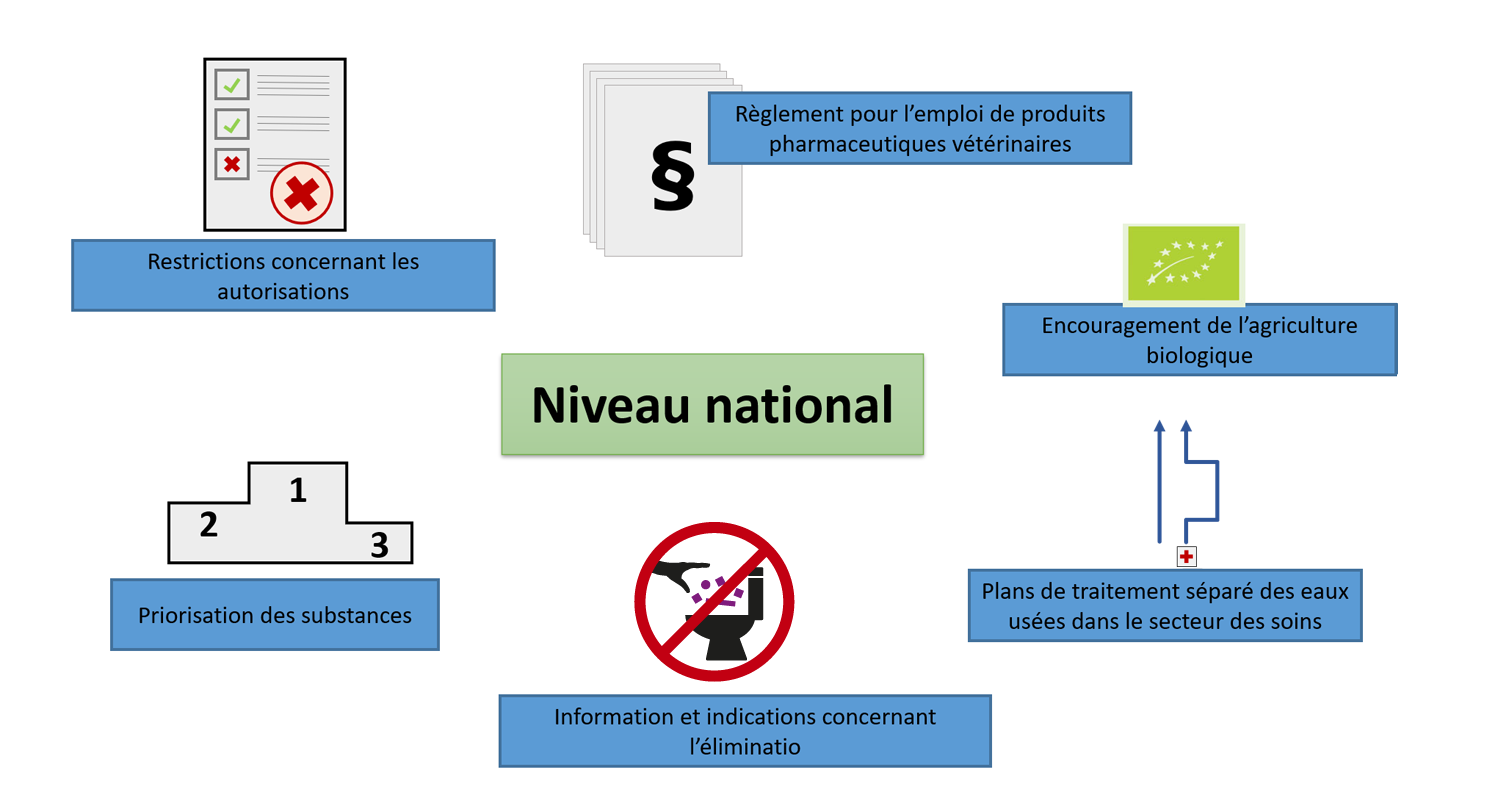 Des procédures d’autorisation existent au niveau national et européen pour les produits pharmaceutiques de même que pour les pesticides et les biocides. Des critères ont été déterminés pour évaluer l’utilité pour le grand public par rapport aux dangers pour la nature et l’environnement.