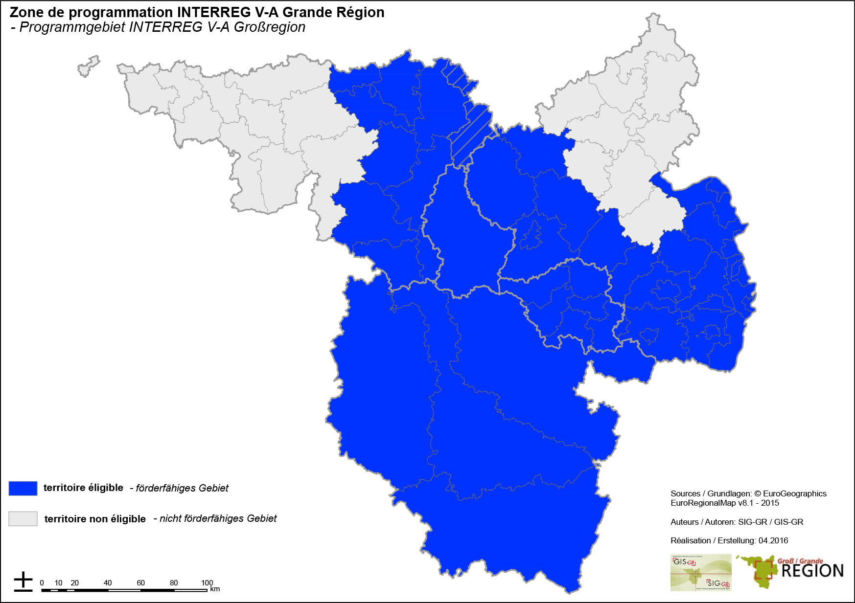Das vom Programm Interreg Großregion abgedeckte Gebiet ist jedoch kleiner als der politisch definierte Kooperationsraum der GR. Dies ist in der nebenstehenden Karte verdeutlicht.