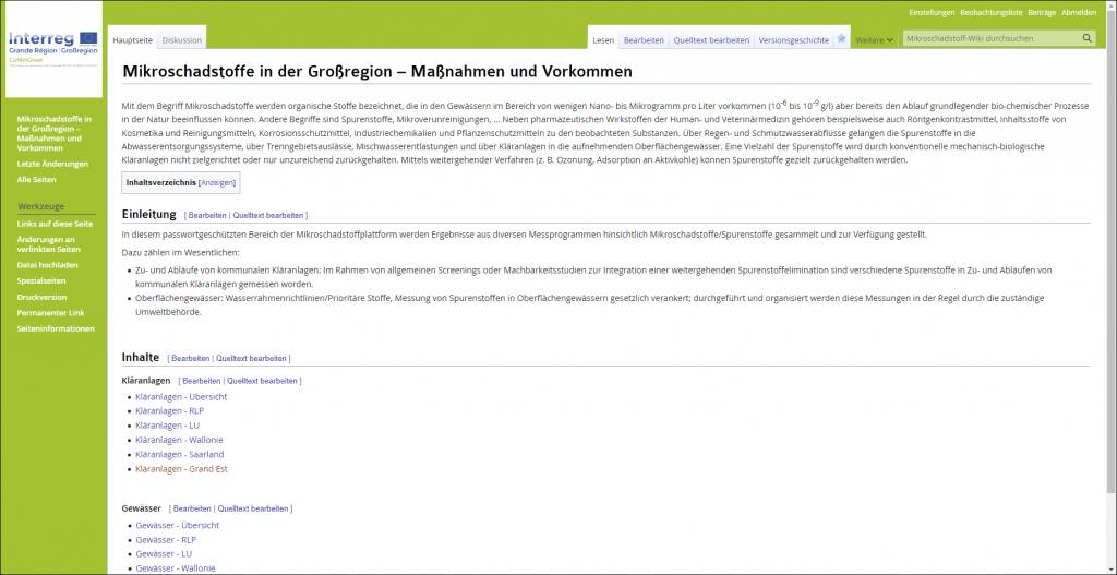 Im passwortgeschützen Wiki-Bereich der Mikroschadstoffplattform werden Ergebnisse aus diversen Messprogrammen hinsichtlich Mikroschadstoffe gesammelt und zur Verfügung gestellt.